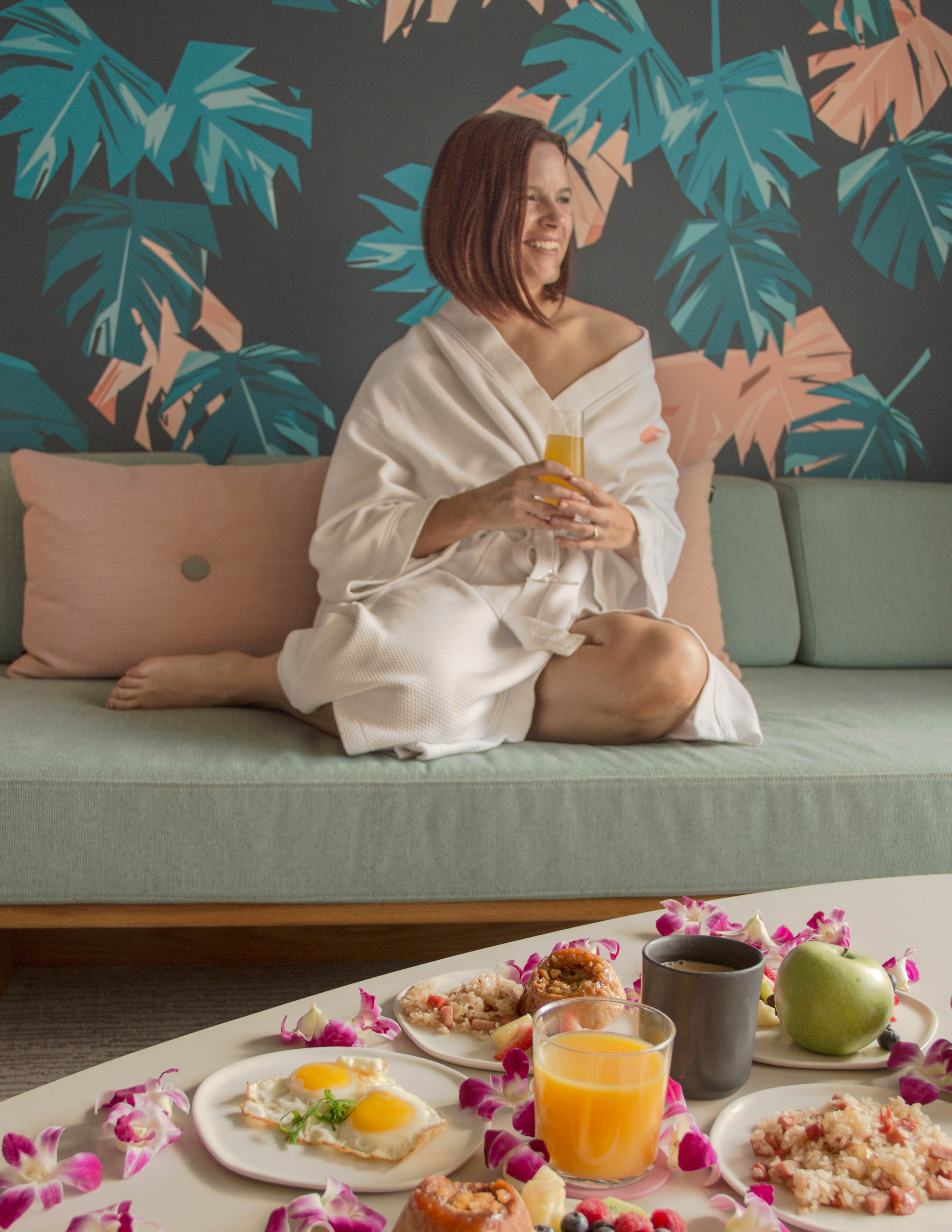 The Laylow is a part of Marriott’s Autograph collection, which means you can expect the level of service one comes to expect from Marriott. The hotel is decked out in vintage Hawaiian style, with warm wood tones and tropical plants everywhere. You are greeted at the front desk by a wall of hula girl ornaments while the person manning the complimentary snow cone cart makes you your favorite flavor. The restaurant and coffee shop are open air, surrounded by lovely greenery and a tiki vibe. You can sit with your coffee in the hanging eggs chairs, or gaze on the action on Kuhio Avenue as the hotel begins on the second floor on the building. The rooms are clean and airy, and have the cutest and most colorful wallpaper behind the beds, perfect for a great breakfast and bathrobe Instagram shot.